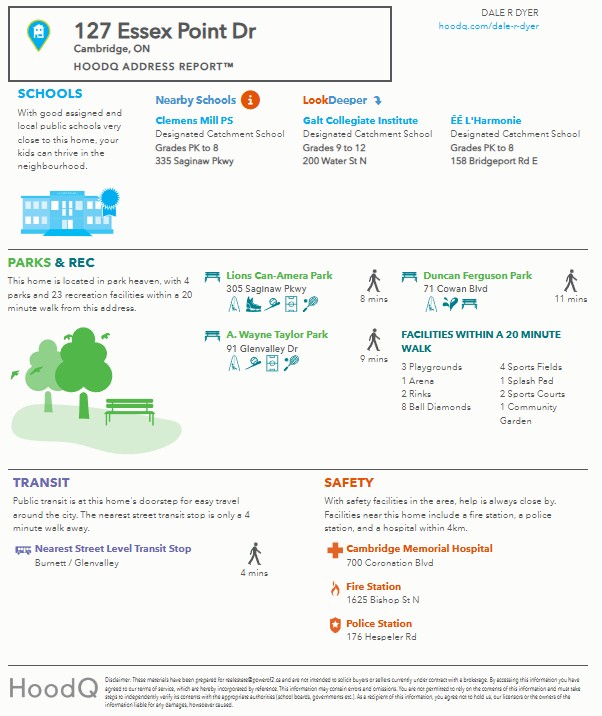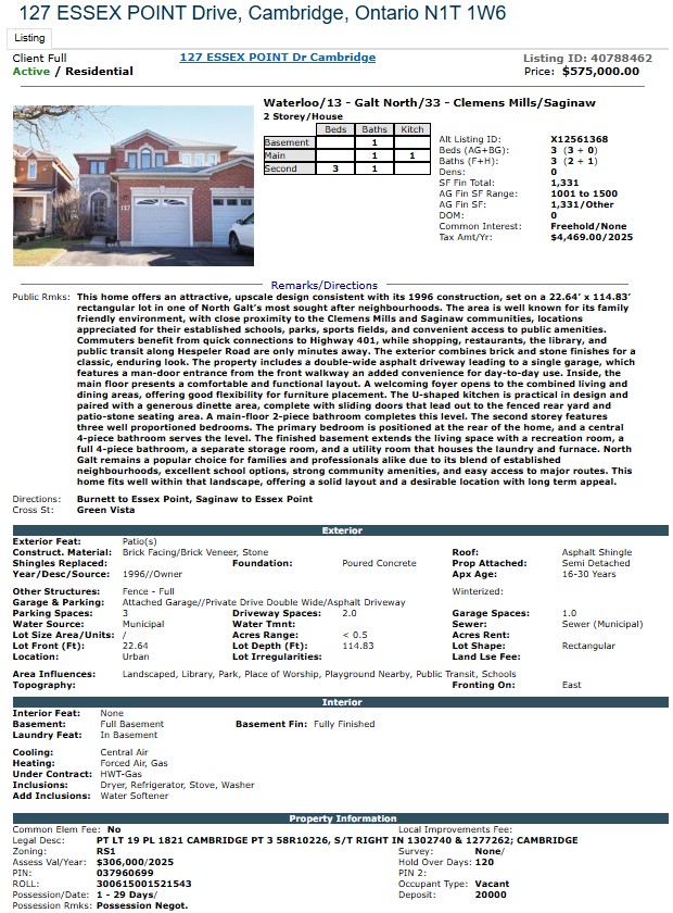 This home offers an attractive, upscale design consistent with its 1996 construction, set on a 22.64’ x 114.83’ rectangular lot in one of North Galt’s most sought after neighbourhoods. The area is well known for its family friendly environment, with close proximity to the Clemens Mills and Saginaw communities, locations appreciated for their established schools, parks, sports fields, and convenient access to public amenities. Commuters benefit from quick connections to Highway 401, while shopping, restaurants, the library, and public transit along Hespeler Road are only minutes away. The exterior combines brick and stone finishes for a classic, enduring look. The property includes a double-wide asphalt driveway leading to a single garage, which features a man-door entrance from the front walkway an added convenience for day-to-day use. Inside, the main floor presents a comfortable and functional layout. A welcoming foyer opens to the combined living and dining areas, offering good flexibility for furniture placement. The U-shaped kitchen is practical in design and paired with a generous dinette area, complete with sliding doors that lead out to the fenced rear yard and patio-stone seating area. A main-floor 2-piece bathroom completes this level. The second storey features three well proportioned bedrooms. The primary bedroom is positioned at the rear of the home, and a central 4-piece bathroom serves the level. The finished basement extends the living space with a recreation room, a full 4-piece bathroom, a separate storage room, and a utility room that houses the laundry and furnace. North Galt remains a popular choice for families and professionals alike due to its blend of established neighbourhoods, excellent school options, strong community amenities, and easy access to major routes. This home fits well within that landscape, offering a solid layout and a desirable location with long term appeal.